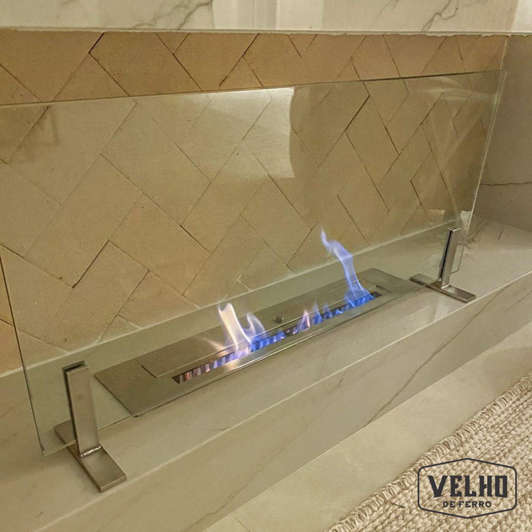 Frente de lareira em vidro! Traz para o ambiente um ar de requinte e sofisticação, um complemento para a lareira ecológica.