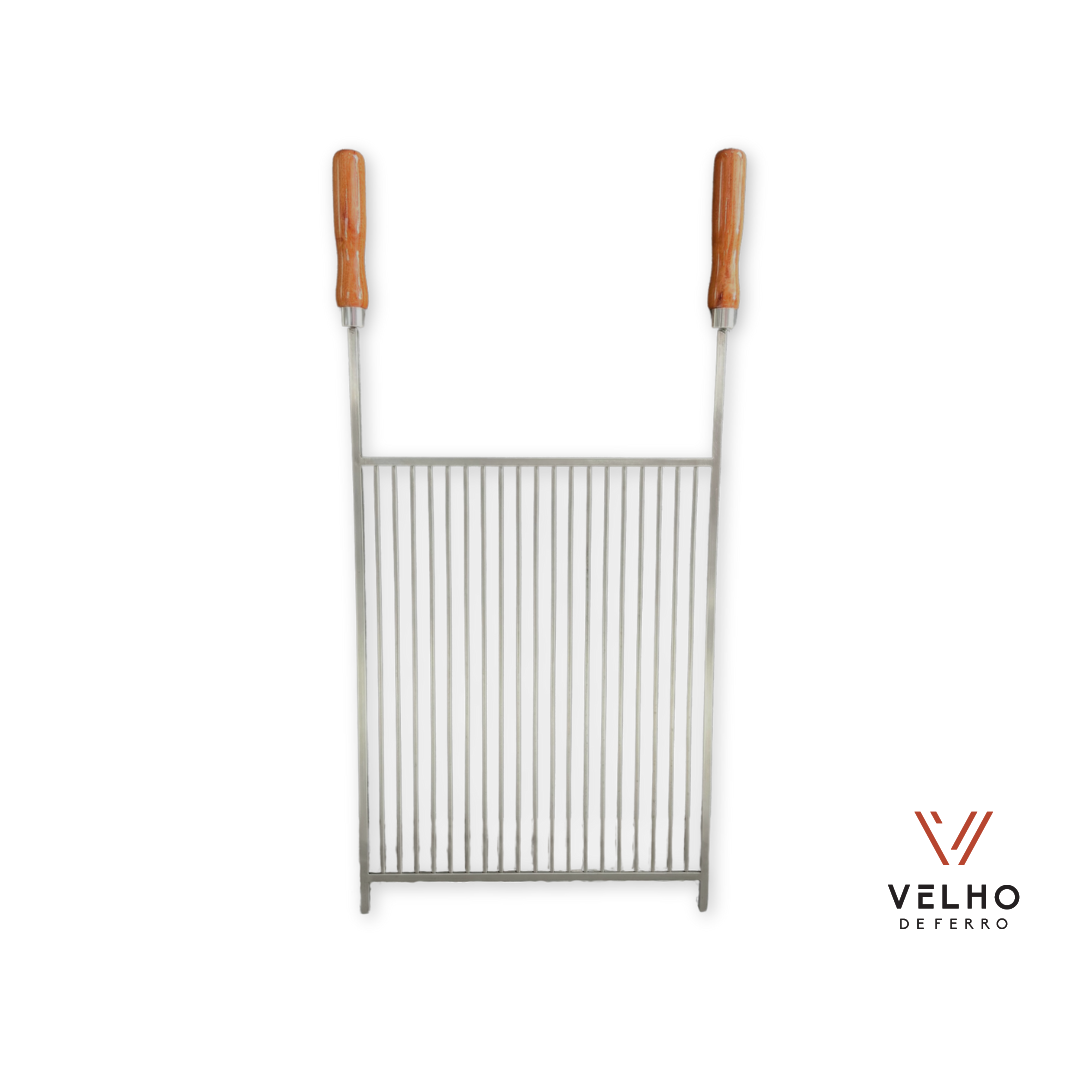 A área útil da grelha possui 41 cm de largura e 50 cm de profundidade. Conta com cabos em madeira nobre e hastes de 18cm, que facilitam o manuseio da peça durante o uso, dando maior segurança ao churrasqueiro na hora de conferir o churrasco.